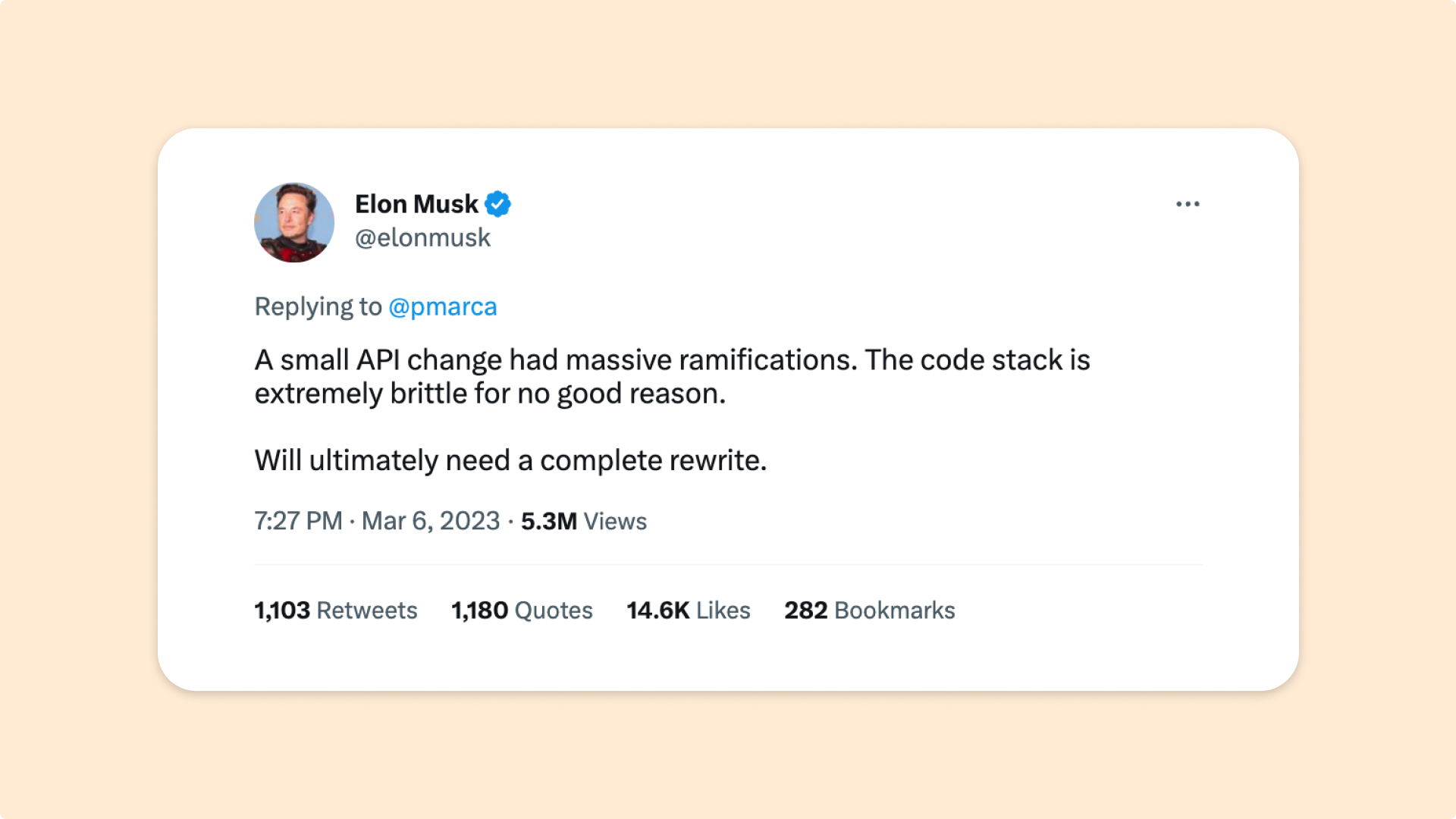 One of the most recent and widely discussed examples of technical debt is Twitter, which has recently had a lot of technical problems related to technical debt. One of Elon Musk's tweets: