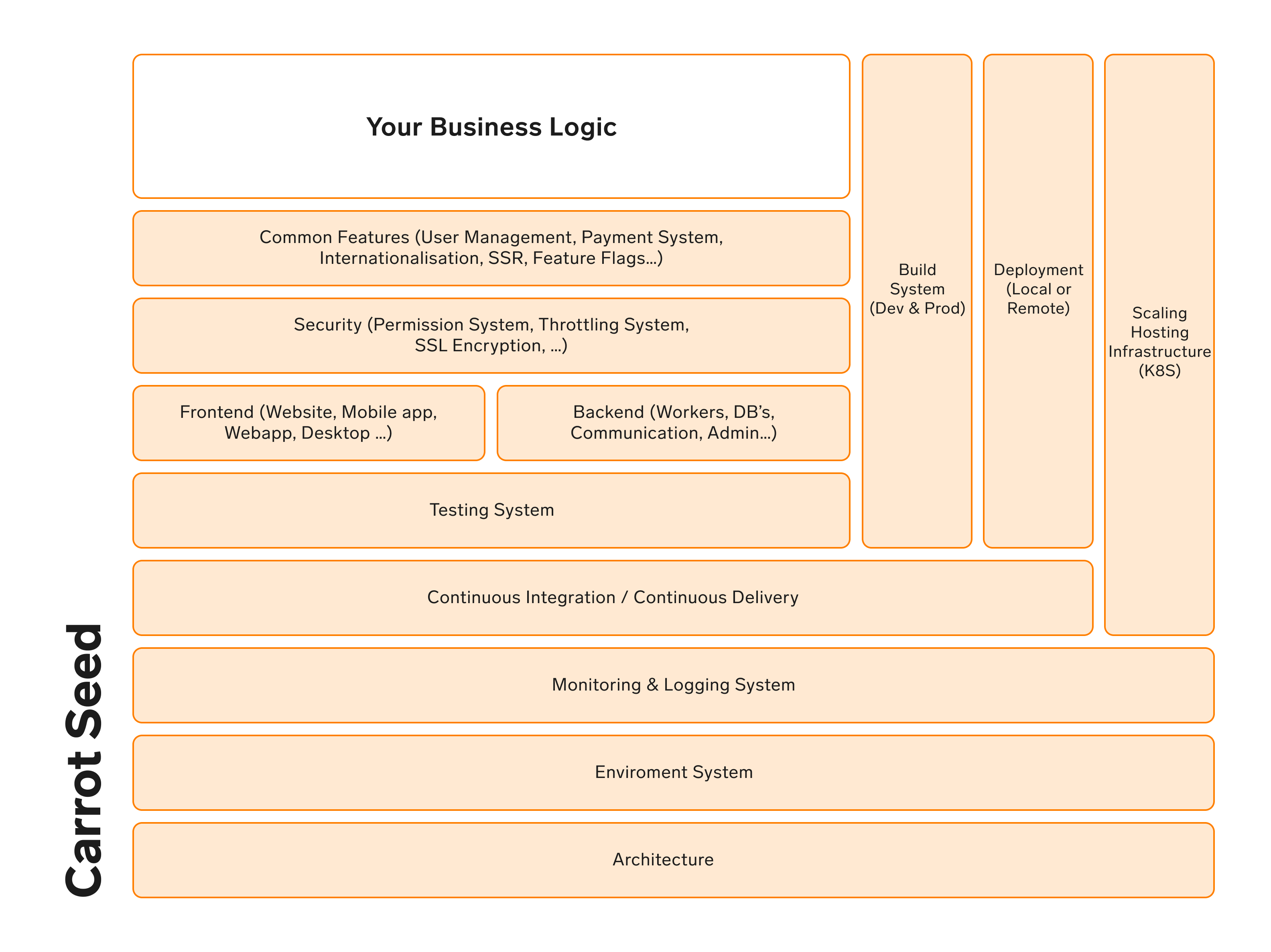 For Carrot Seed, we have put together a core set of libraries and frameworks that can be found in almost every SaaS system. We've connected them smartly, creating a foundation that saves us all the preliminary work for each project.