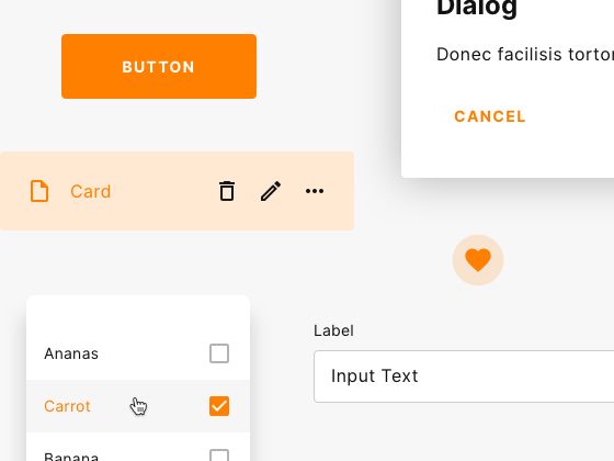 You want ready to use components for common cases built on material design? Then our built in component catalogue and our Figma Design System are just what you need.